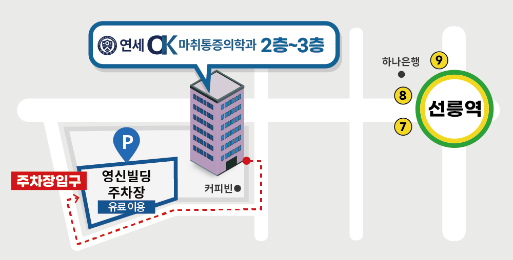 안녕하십니까? 선릉역에 위치한 연세OK는 다년간의 풍부한 임상경험을 바탕으로 척추ㆍ관절 건강을 지키기 노력하고 있습니다. 마취통증의학과 전문의가 척추ㆍ관절, 신경통증을 비수술적 시술을 통해 치료하고 있으며, 차별화된 주사치료, 도수/물리치료를 통해 치료의 완성도를 높이고 있습니다. 언제나 최선을 다하는 연세OK 마취통증의학과가 되겠습니다.